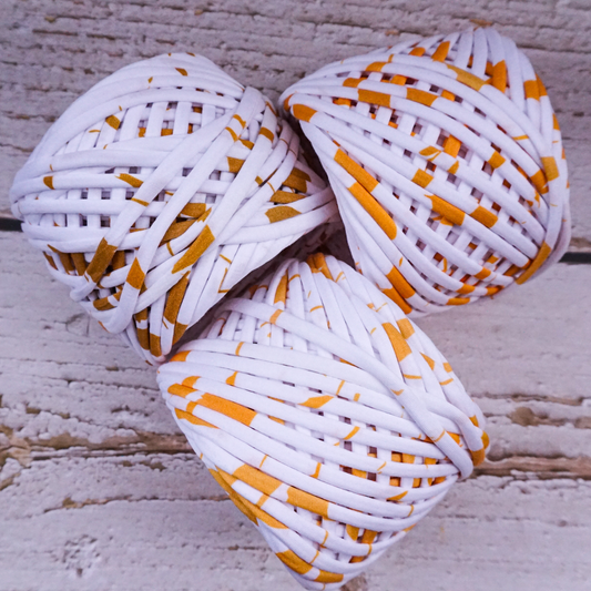 T-shirt yarn for crocheting baskets, bags, rugs and home decor. White with gold strokes