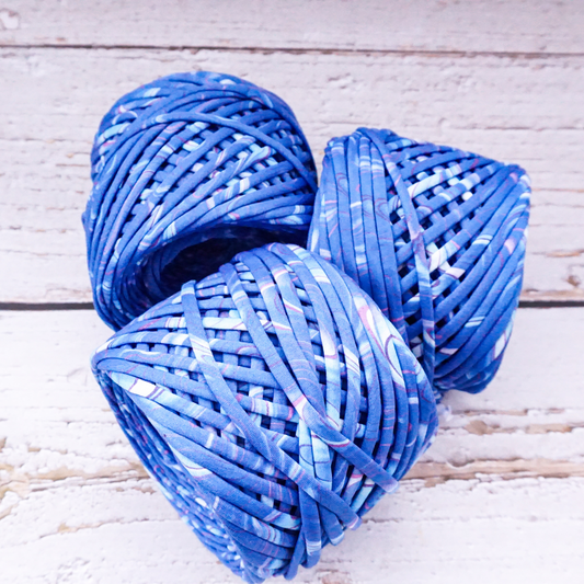 T-shirt yarn for crocheting baskets, bags, rugs and home decor. Blue cosmic