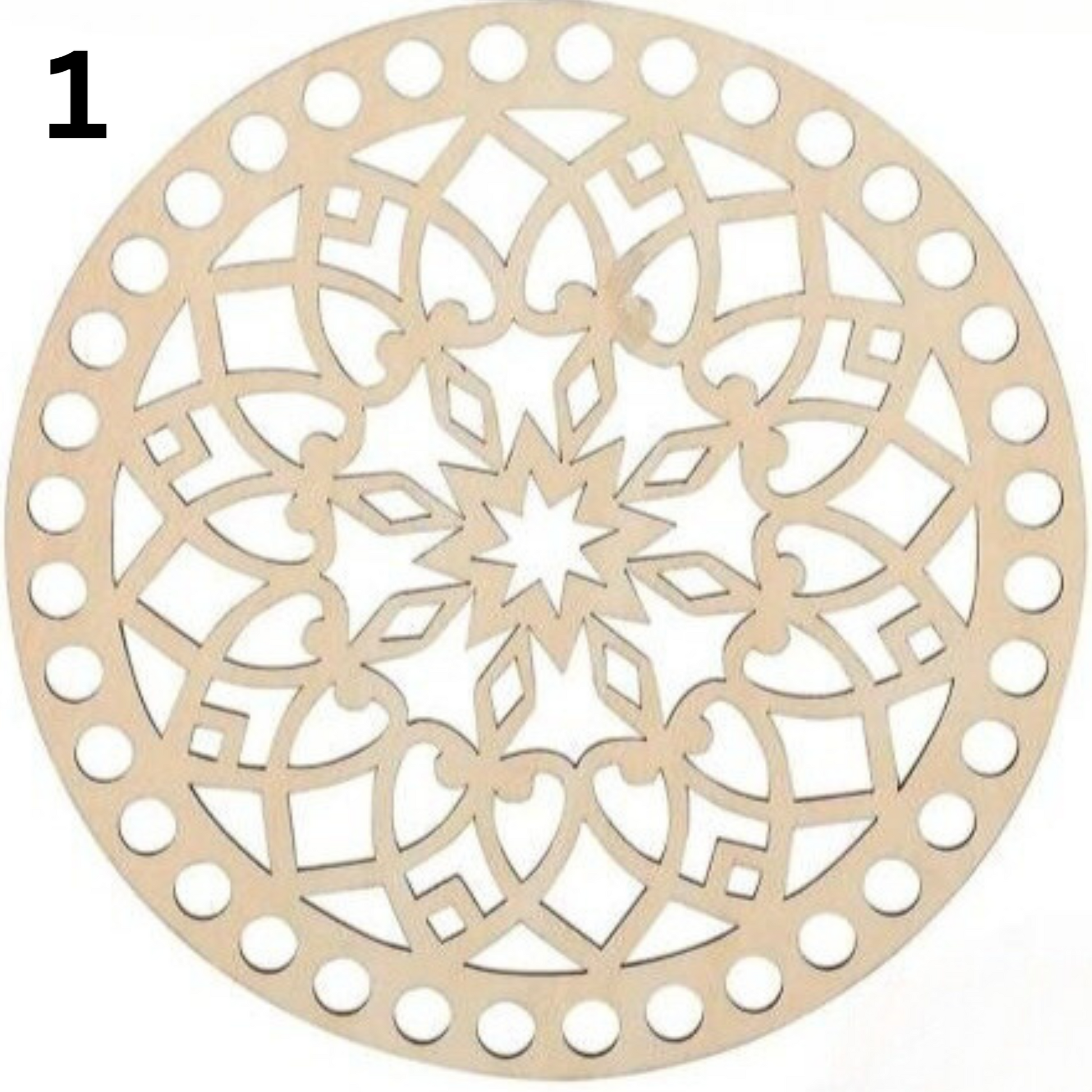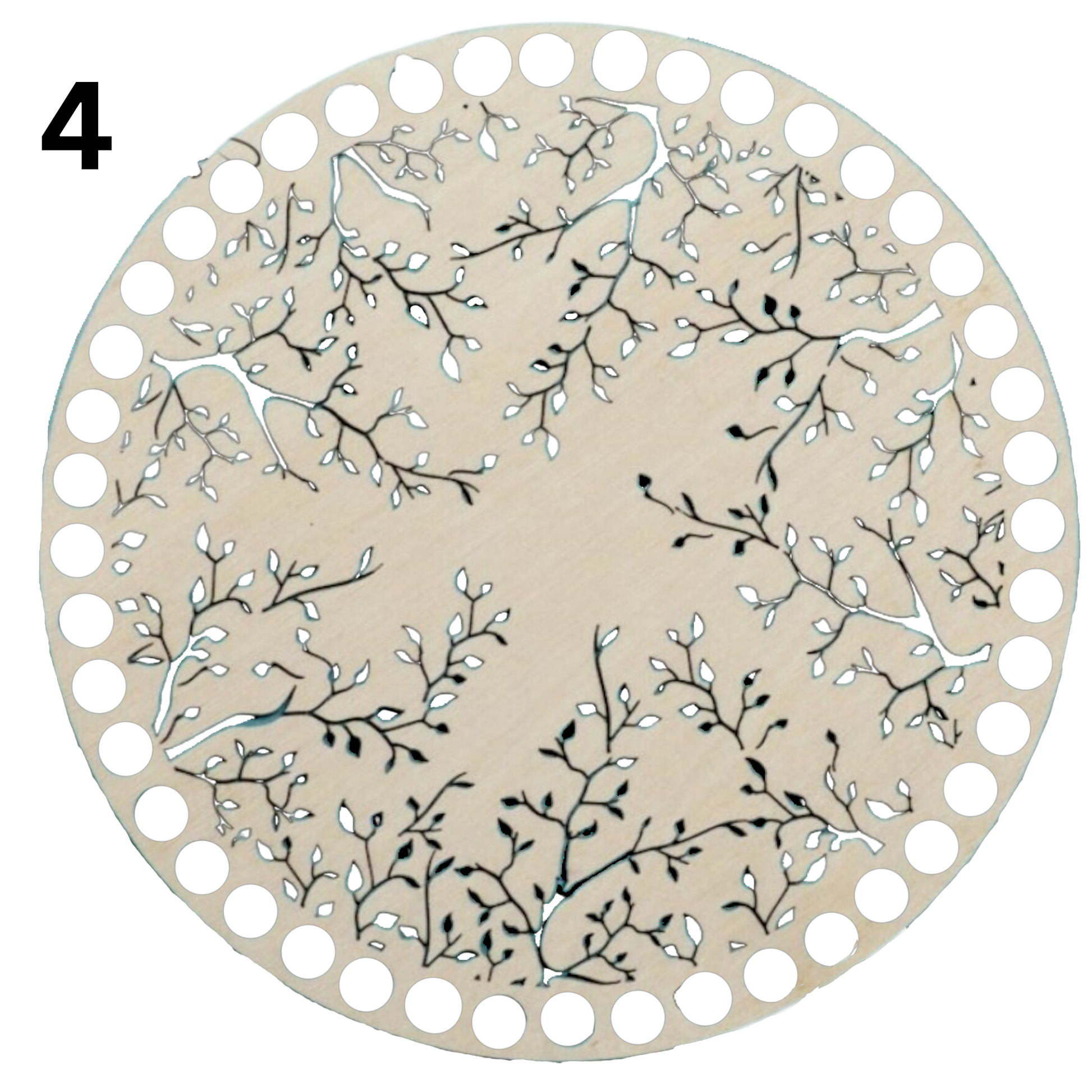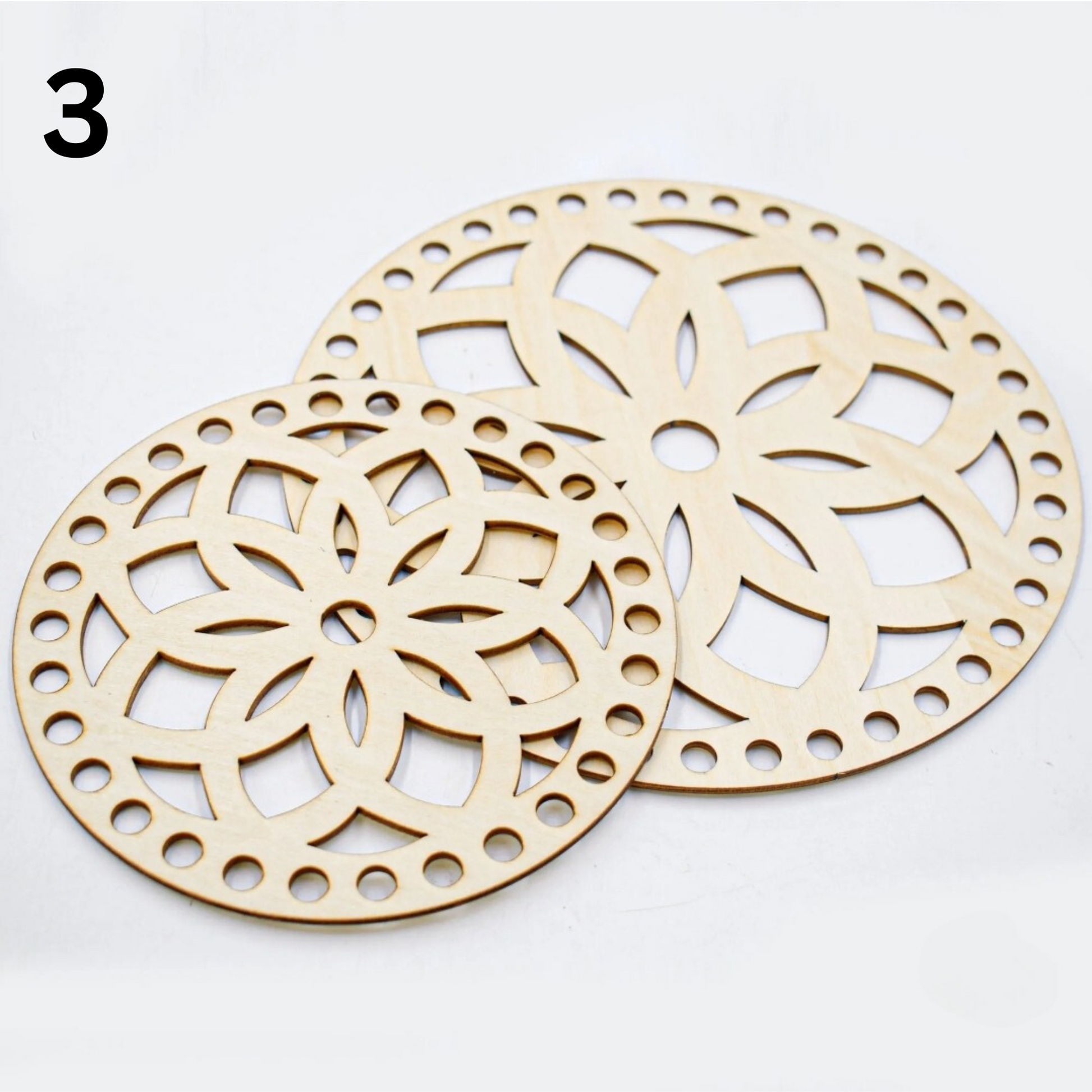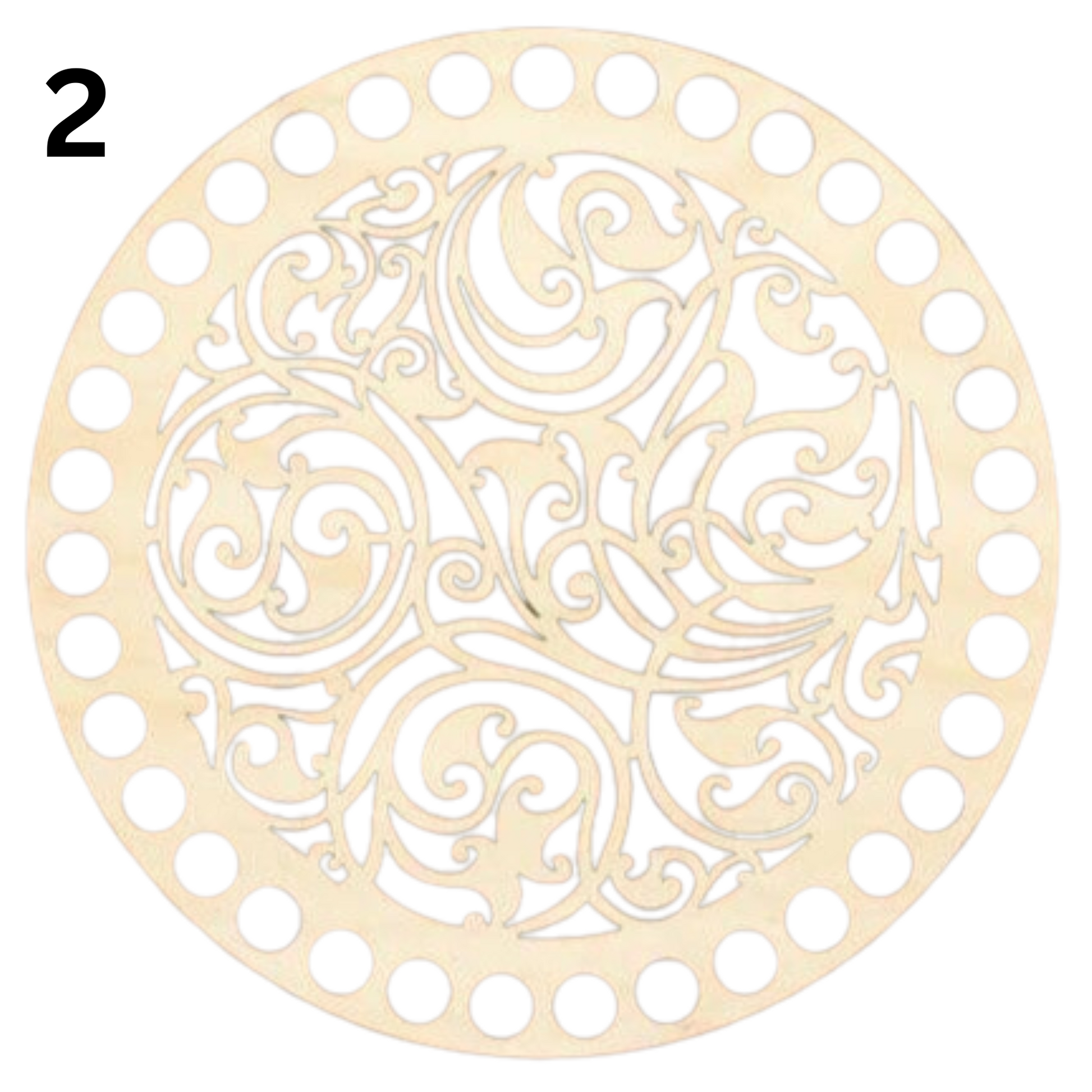 Round Wooden base lid with cut out designs for crochet basket